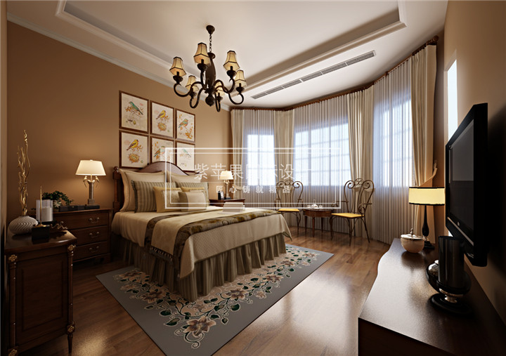 卧室床头采用软包装作为装饰,搭配艺术墙纸。吊顶是传统中轴对称的形式追求时尚而不浮躁,庄重典雅而不乏轻松浪漫的感觉。