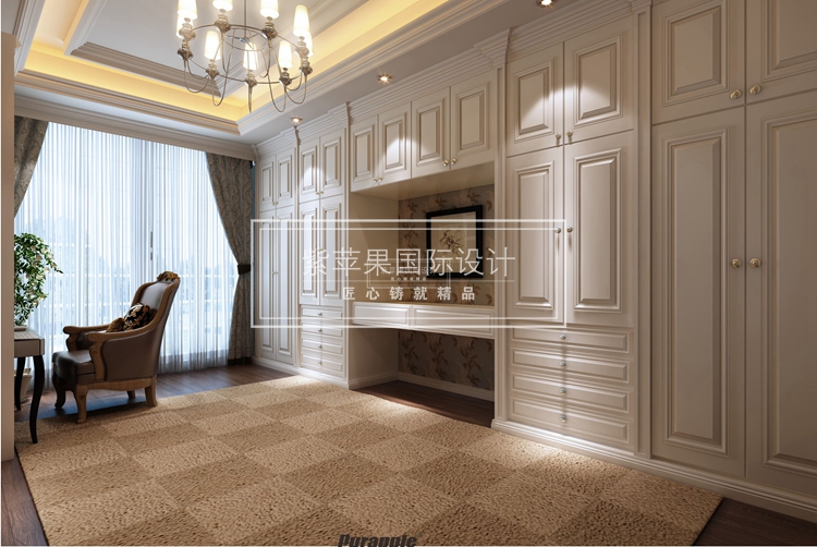 别墅中式装修设计女儿房书房的设计没有沿用较为正式刻板的中式暗沉色调,采用明亮的米白色调,清新简约,迎合了女孩子的审美观,给人感觉格外返璞归真、与众不同,女孩子的纯洁优雅也得以体现。
