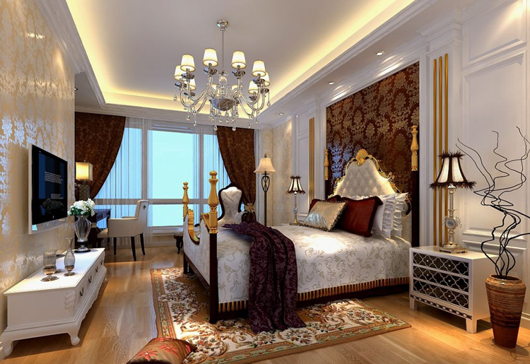 地面采用石材拼花,用石材天然的纹理和自然的色彩来修饰人工的痕迹。使客厅和餐厅的那种奢华、档次和品位毫无保留地流淌。 在家具配置上,多选用板木结合的实木家具,家具漆面具有封闭漆效果,不仅能将木皮的纹理尽情展示,在徒手触摸时,还能感受到油漆饰面后的光滑、平整。