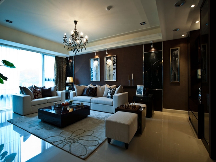 客厅空间明朗的色彩搭配、硬朗的线条设计,简单、时尚、大气。电视背景墙以整块大理石为装饰,在一片象牙白中与深色窗帘相呼应。沙发背景墙上的巨幅画作丰富了空间视觉,体现了主人不俗的文化修养。