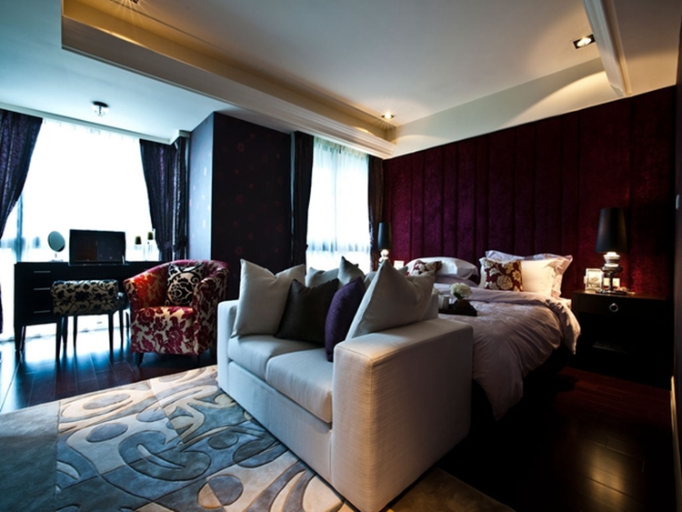 主卧床头背景墙引入中式对称的设计手法,紫红色的色调搭配木格纹面板,在暗色系床品及布艺窗帘的承托下,为卧室营造出一派深远幽雅、宁静的空间氛围。