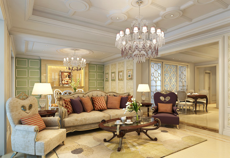欧式灯以华丽的装饰、浓烈的色彩、精美的造型达到雍容华贵、富丽堂皇的欧洲宫庭效果,欧式灯注重线条、造型以及色泽上的雕饰,配合客厅设计的主色调打造视觉上的华丽体验。