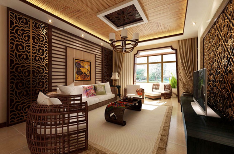 当然,也可以在吊顶设计中添加一些自然元素,例如绿植等作为一小层的隔断,从上飘下来的绿色清新自然,别具自然风味。在东南亚风格的家装设计中,材质也以自然为主,吊顶也不例外。质朴自然而原始的风味可以算是东南亚风格家装的精华。就如上面东南亚吊顶装修效果图中的展示,可以选择一些自然材质制作的灯饰配饰等用来装饰吊顶,美化空间环境。最后,吊顶作为空间的一部分也可以融合其他元素,例如添加简欧式的边框令空间在视觉上显得更大更轻松。