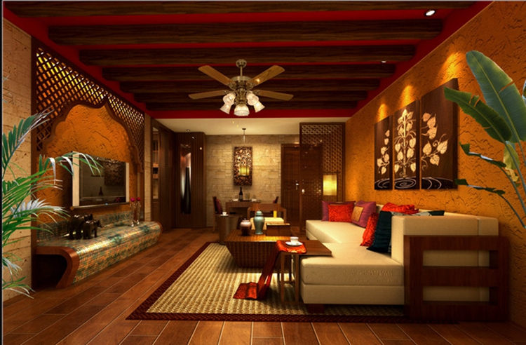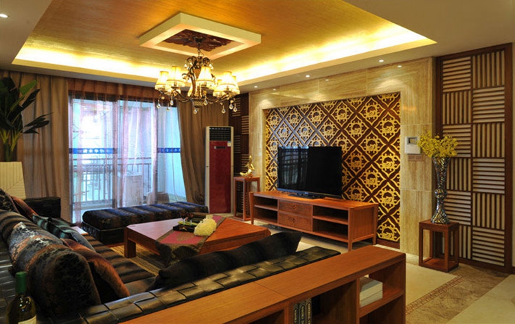 在吊顶灯具的选择上,尽量选择别具东南亚风格特色且能够搭配空间整体布局装饰的灯饰,可以是繁复华丽形态独特的玻璃吊灯灯饰,也可以是相对简约的射灯。另外,也可以在茶几或是角落布置有周边配饰相匹配的独具特色的台灯,既起到装饰作用,又有功能性,搭配和谐,线条错落有致。东南亚风格的吊顶一般在设计上还注重夸张的造型,因此常常会见到大风扇的装饰灯饰,随意舒适却又自成一体。