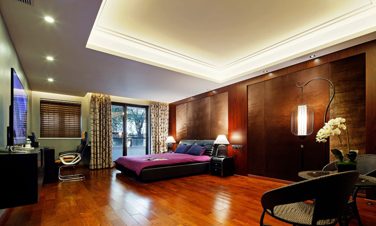 卧室的雅致和美如影随形,米色为主色,深蓝色铺陈其间,花鸟的墙纸向中式致敬,造型独特的装饰艺术摆件和花艺使整个卧室清雅迷人。材料以木质为主。讲究雕刻彩绘、造型典雅。多采用酸枝木或大叶檀等高档硬木,经过工艺大师的精雕细刻,每件作品都有一段精彩的故事。而每件作品都能令人对过去产生怀念,对未来产生一种美好的向往。