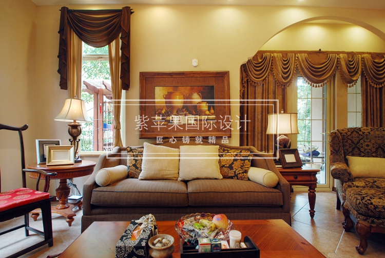 仔细观察发现该案例并不全是纯粹的美式风格,准确来说这是一款中式与美式的混搭风格,传统的中式太师椅,中国红的座垫,美式风格华贵的窗幔设计和经典的素描水果壁画,虽然是两种不同的风格,却并不突兀,反而二者相辅相成,营造了1+1大于2的效果。这种上海美式风格设计中的混搭风也是可以借鉴的哦。