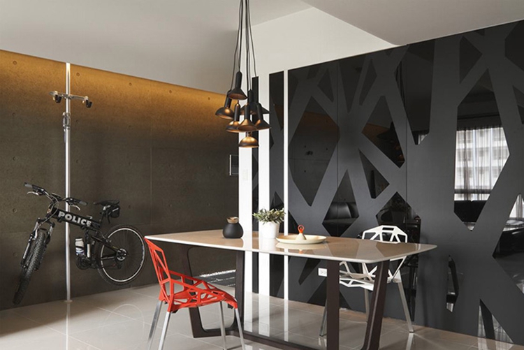 简洁不等同于简单,业主是准备结婚的年轻夫妇,当时说的是先好好享受几年的二人世界再考虑孩子的事情。所以我们的餐桌设计也是极简风,跟客厅打通整个空间布局,开放式的设计让整个空间看起来更加开阔。造型别致的两把餐椅搭配工业风十足的吊灯。夜晚时分,伴着温馨的灯光,两人坐在一起畅想美好的未来,想想都觉得浪漫。
