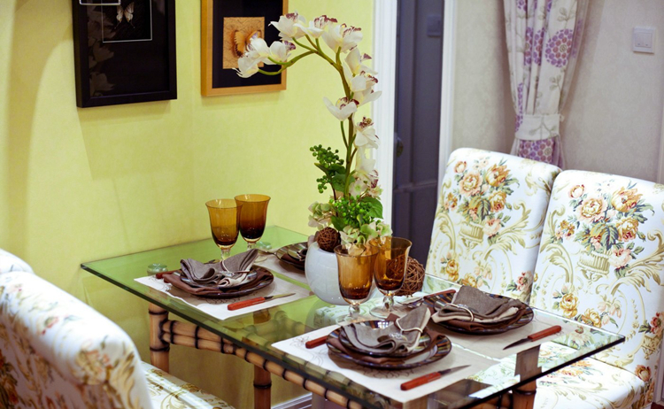很多小户型结构特殊,比如遇到穿柱,可以巧妙的设计成转角遇到爱的异型餐桌,一般是清新的小碎花,星星点点地散发着幽香,另一边则是漫不经心地惬意用餐。