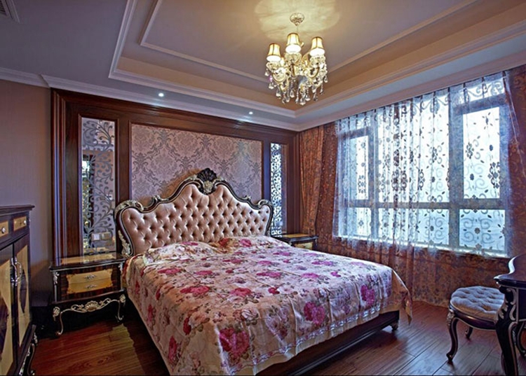 卧室是每套居室中最安静的空间,多会采用木质地板来表现美式的古典与休闲,大量碎花元素的应用,造就了卧室休闲舒适的非凡气质。古典吊灯与深色木地板,匠心独具精雕细刻的家具,散发着美式乡村的古朴典雅,典雅的色调让人倍感温馨。