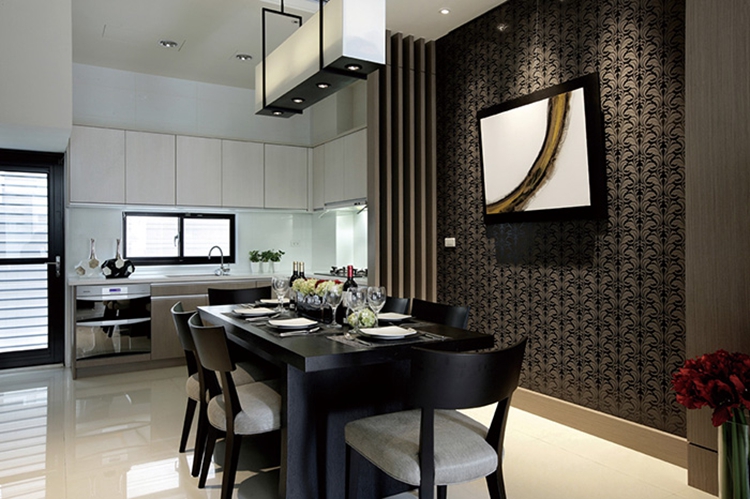 餐厅和厨房、客厅一体开放式的设计,公共空间通过敞开布局,完成了空间的互补,让整个客厅看起来更加宽敞开阔,每个空间的功能更加实用,充分发挥其功能性。“L”造型的厨房,方便同时合理利用了空间。亮黑色的餐桌搭配白色的大理石地砖,相互衬托,桌上的高脚红酒杯和精致的餐具为就餐环境增添了几分情调,浪漫温馨。