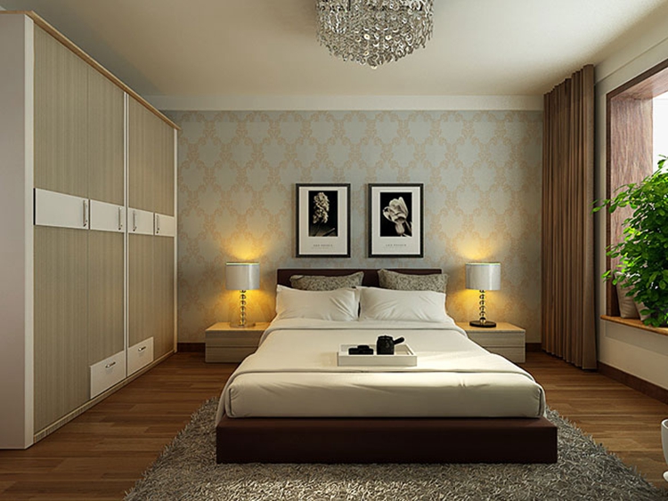 不光是本案例中的卧室,从进门的客厅开始现代简约设计的精髓就贯彻始终,设计来源于生活最终又回归生活。在本方案的卧室里,使用原木色木质地板,搭配浅灰色的纯毛地毯,虽然色彩比较低调,但不失大方成熟。床头左右两侧的台灯和吊灯发出柔和的灯光搭配简单实用的衣柜,体现着卧室对实用性和舒适性的本质追求。
