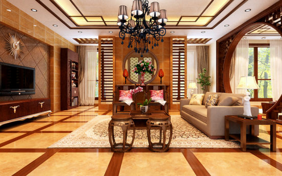 整个空间的设计,墙面大面积的使用了中式风格常用的原木材料家具,搭配经过提炼的欧式线条,中西风格的混搭更是文化的碰撞与融合,彰显着时尚潮流。中国风图案的吊顶古色故乡,结合提炼过的石膏线勾勒出线框,搭配欧式吊灯,整个元素的混搭不仅不让人感到突兀反而让人感觉到一切是那么地随意自然。