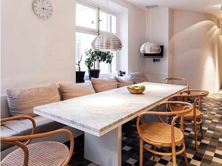 留白是北欧风格常用的设计手法,它可以让思想跳跃,让灵感迸发,很符合年轻人的审美。现代几何的长方形大理石餐桌,质感十足,木质的餐椅,曲线灵动,造型别致,同时设计符合人体工程力学,增加空间的层次感,让这个简洁的餐厅空间看起来虽然简单却散发着时尚摩登的浪漫气息。