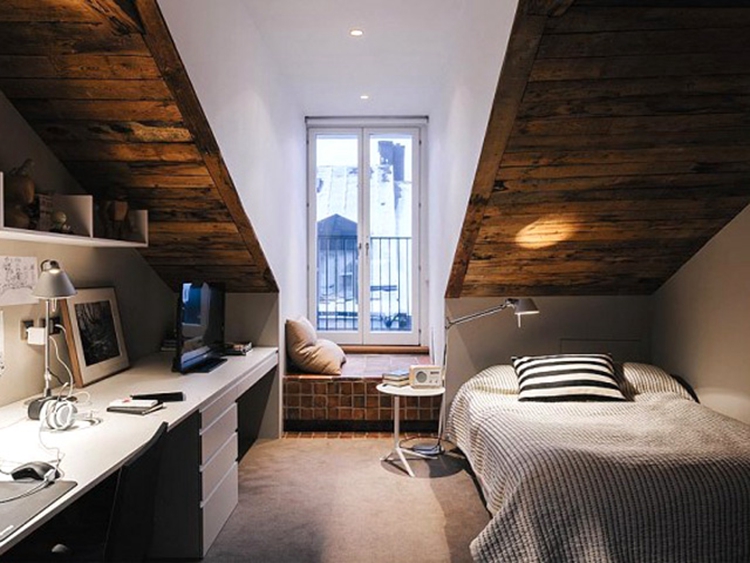 这是将小阁楼设计成了一个卧室和办公合二为一的功能性空间,原木装饰的斜顶看上去随意自然,赋予其原生态的悠闲。其他空间采用北欧风格惯用的白色,空间虽小,却也是功能俱全。床旁仿榻榻米的设计可以满足主人中午倚墙而坐,沐浴着温暖的阳光小憩一会,试想还有什么比这更惬意的生活呢,简直就是羡煞旁人。
