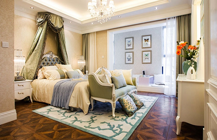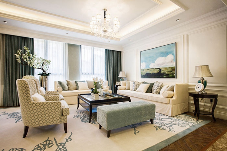 乳白色的墙面营造出来的优雅洁净取代了传统欧式巴洛克风格的奢华富丽,绿色和暖黄色等清新温暖的颜色加以点缀,有别致图案的地毯和插花盆景等艺术装饰,但一切看上去那么地自然随意,不浮躁,不张扬,带给人沉淀、深厚、悠久醇香的感受。素雅温馨的仿木大理石地板让整体看起来更加明亮大方,又不显浮华。
