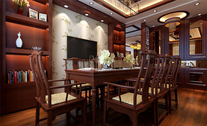 餐厅的空间不大通过整体大气典雅的布局设计让整个空间并不会让人感到压抑,古红色的餐桌椅搭配暖黄色座垫,黄与红这两种中国最为传统的颜色融合在一起,古典风情洋溢在空间的每一个角落。一家人围坐在一起,营造出舒适恬静的用餐环境,优雅而又庄重。