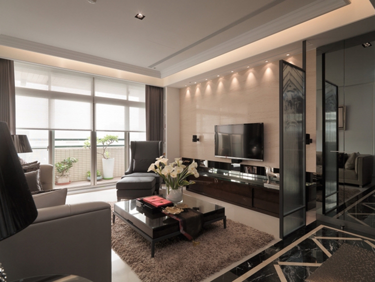客厅部分,奶茶色,高级灰搭配亮黑色的家具,但从色调的选择来说,硬朗而富有质感。尤其是那洁净明亮的浅咖色大理石瓷砖拼接而成的电视背景墙,使得整个空间活泼灵动,清新自然。整体的布局设计在追求空间的连续性和形体变化的层次感中,让整体空间豁达大气,却不失精致与温和。