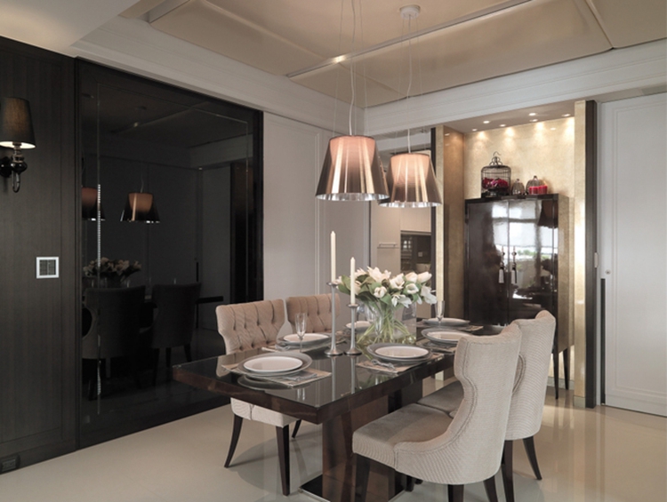 镜面玻璃元素搭配棉麻布艺材质的混合运用,赋予餐厅空间层次感和叠加而成的优雅。简约的餐椅造型符合人体工程力学,精致的餐具和烛台与一旁的百合花相映成趣,浪漫而又惬意。高级灰和硬朗黑的延续,给人明快感觉之余,像一股暖流包围着空间的一切,那么温馨、那么安详。