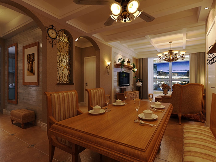 美式风格重在风情,而古典的风情由色彩打造,所以美式对色彩质感要求很高。它不同于欧式的金碧辉煌也不同于田园风的小清新,美式风格以复古砖为主进行装饰,简约大方,散发出古朴优雅的古典气息,演绎浪漫的怀旧风情。就像本案例中您所看到的客厅,整体空间看似繁琐,仔细看却没有过多的装饰,十分含蓄,洋溢着生动的气韵,寓意着和美的生活,如意的未来。