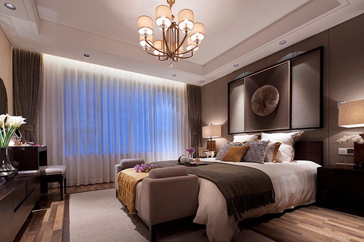 卧室的设计力求温馨,新中式风格更是如此,多运用原色的木质地板铺贴打造空间的温馨静谧。白色的床品搭配咖啡色的的床旗就像是一幅中国画,颇有已经。床头背景墙运用硬包壁画等装饰来营造空间的浪漫风情。大飘窗搭配薄纱窗帘的设计,朦胧之中可以看到外面的月色和夜空,朦胧感神秘感给人带来温馨舒适的惬意感受。