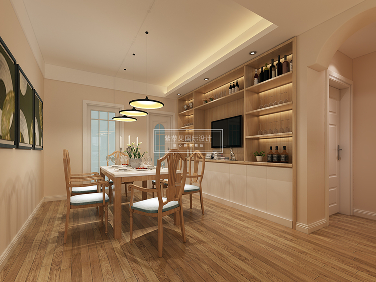 进门玄关设计了一处拱廊,结合业主的户型结构,进行了一个简单的装饰处理,入门右手边即是餐厅,地板采用原木色彩的拼接地板设计,地板纹路的呈现自然而且优美,触感非常好。立面墙做了一处现代风格的简单壁柜,用来存放酒水、杯具和饮料,对面立强则大单的运用了3幅水彩画来增加装饰效果,渲染餐厅的氛围,正中间3盏艺术吊灯则是最后的点睛之笔,非常的温馨舒适。