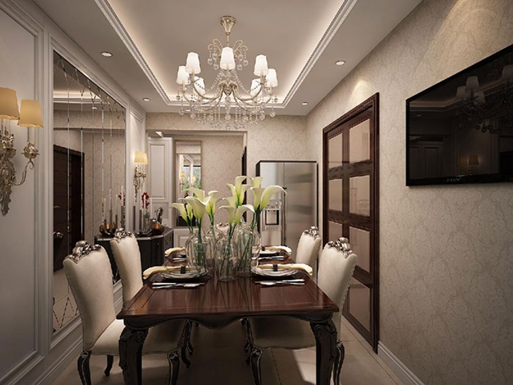 餐厅的设计没有采取现在流行的开放式布局设计,这样的好处是单独打造出一个温馨安静的就餐环境,让一家人围坐于此在这样的环境中更容易享受到最原始的幸福感。色调以浅色调为主,没有华丽的装饰点缀,精致的餐桌椅,符合人体工程力学的设计,彰显着紫苹果别墅装修公司设计以人为本的设计理念。雅致的水晶吊灯和素雅的壁纸彰显空间典雅、时尚气质,再搭配餐桌上的几束百合花鲜花,凸显浪漫的就餐氛围。