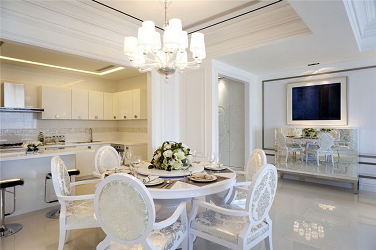 餐厅和厨房开放式的设计让整个空间融为一体,方便了日常的起居生活,又保证了不同功能的空间在各自功能的实现上不冲突。餐桌椅采用明快的奶白色,一方面能突出空间的明亮,让人产生愉悦的情感。造型精致的餐桌椅搭配别致的吊灯,彰显着浪漫温馨的情调。圆形的餐桌象征着中国传统文化里的团聚,一家人围坐于此共享美食,体验着美食带来的最原始的幸福感。