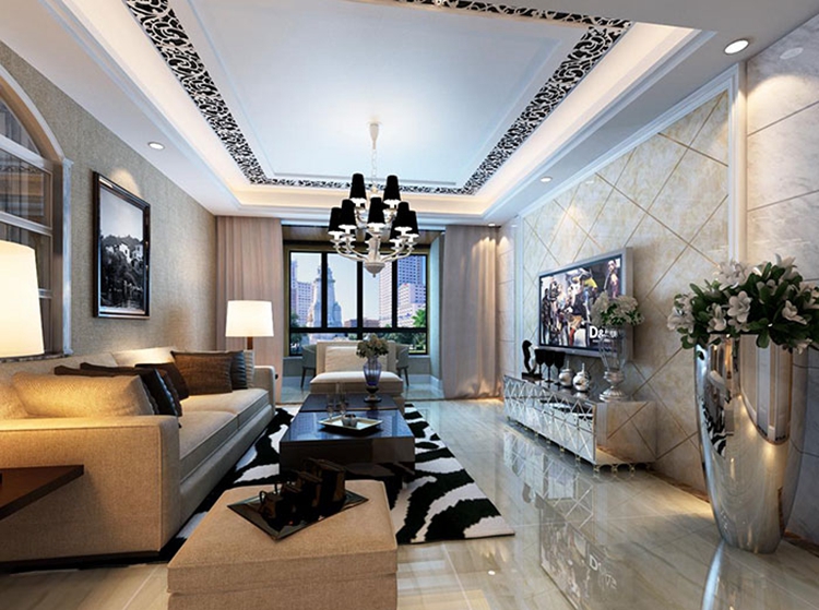 紫苹果别墅装修公司设计师刘老师的这个案例中客厅给人的直接感觉是现代时尚,尤其抛光的大理石地砖给人简约利落的时尚感。造型简单的布艺沙发,虽然看似朴素,但是典雅之中彰显着高贵。亮黑色的茶几和黑白相间的条纹地毯,两种经典的色调搭配在一起,极尽优雅。田园风素雅的沙发背景墙壁纸和菱形瓷砖拼接而成的电视背景墙交相呼应,相映成趣。