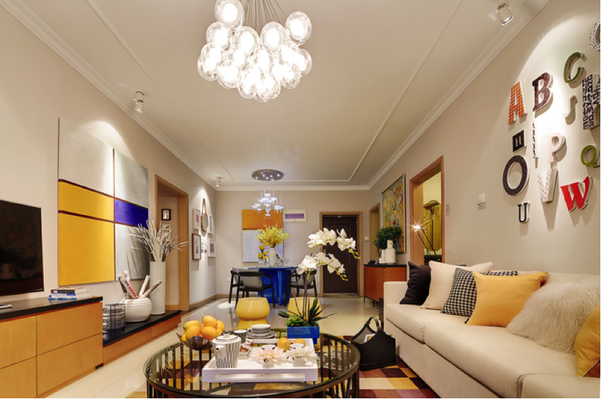 客厅以浅色系为主,搭配深粉色、黄色、白色使室内营造出清新温暖的感觉。圆形的茶几、色彩缤纷的地毯和布艺沙发,处处运用田园元素。悬挂的吊灯、英文字母组成的个性照片墙,既美观又整洁。
