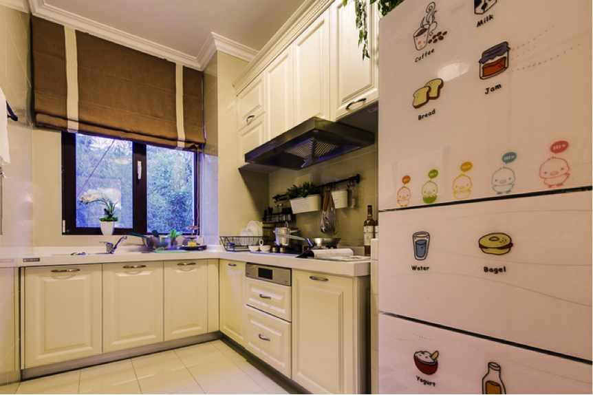 餐厅相对于客厅来说,就简约了许多,整体的颜色一致,通透的玻璃为厨房带来明亮的视觉感受,窗台上绿色植物妆点整个厨房。在烹饪的同时有一股清新伴随着你。将会给你带来无限享受。冰箱上面贴着各类食物的标签,可以显得主人的细心,对家人的爱。