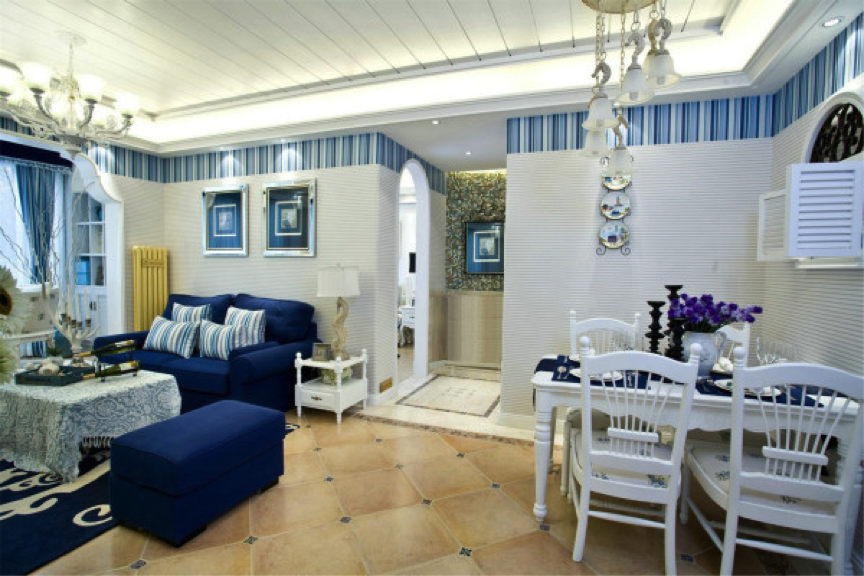 133平地中海风格地中海风格的客厅,以白蓝色为主,这是地中海典型的颜色搭配,象征着蔚蓝的海岸与白色的沙滩,条纹型的抱枕突出了时尚感,将海洋的元素应用到家居的设计中,清爽的同时还添加了不少典雅之感。