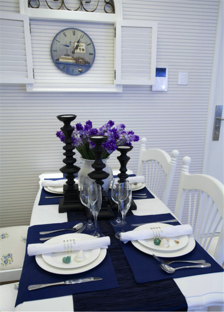 餐厅的空间布局非常合理,地中海特色的餐桌椅,白色实底,以白色为主的色调,让人看起来明亮悦目,深蓝色的插花装饰和白色的水晶吊灯尤为和谐。给人一种自然清新的感觉。