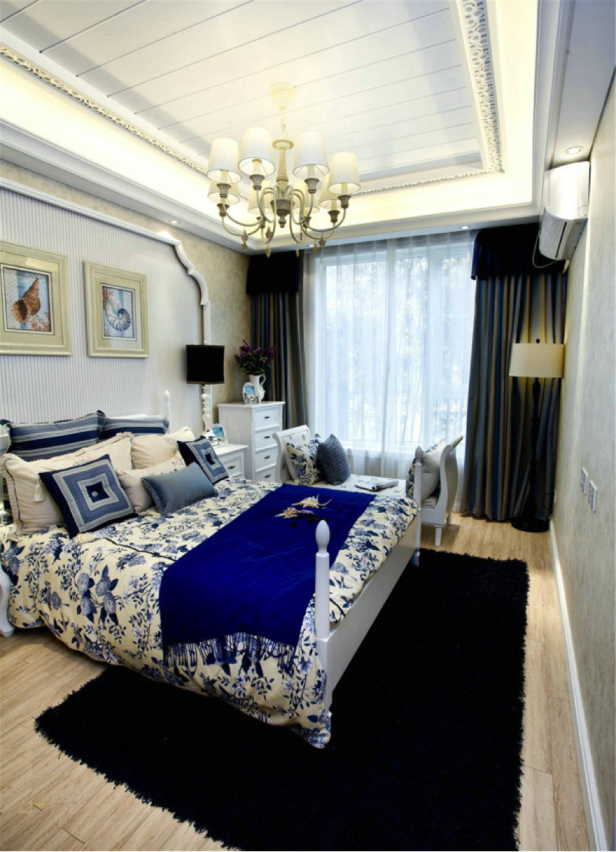 这款地中海风格的主卧,蓝色与白色的床品搭配既时尚又显得非常具有视觉的冲击力,同时又加上二副挂画,在搭配一个铁艺吊灯,又显得非常的时尚,133平地中海风格深色窗帘的搭配又使整个卧室看起来十分的宁静。
