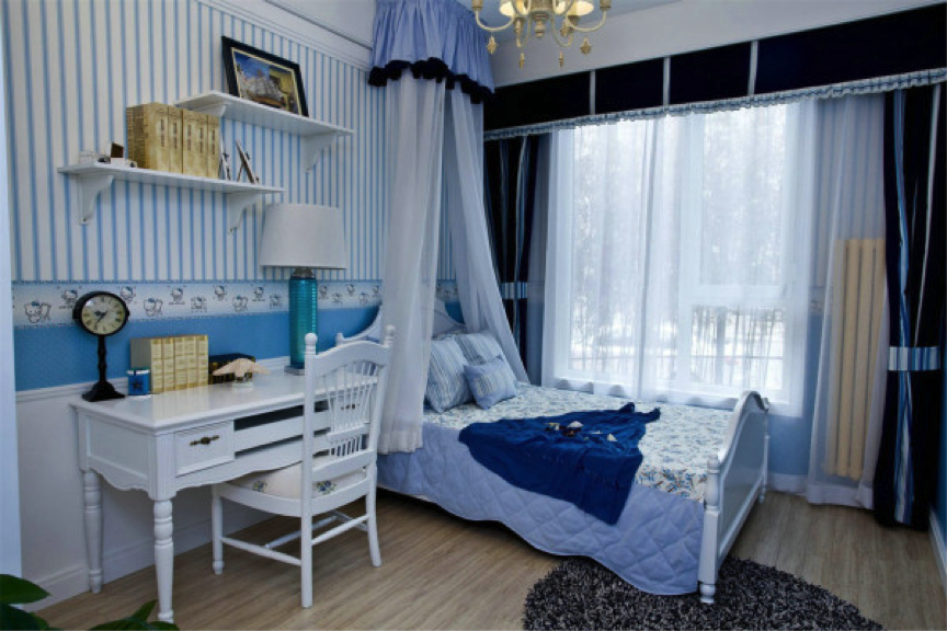 这个卧室是次卧,也传承了经典的蓝与白,整个空间的色调为浅蓝色,淡蓝色的条纹背景墙与床头的纱幔,还有白色的桌椅,空气中都弥漫着轻松的氛围。在紧张的生活节奏中,让身心得到无限的放松。