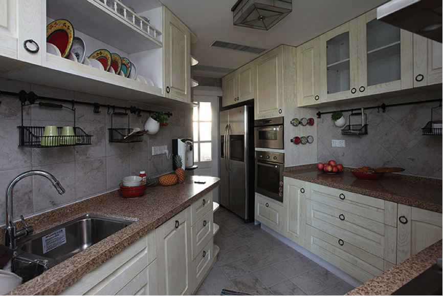以清新淡雅的米白色为主做厨房,给人一种安全、温暖的感觉,深色的柜台,富有视觉层次感,营造出一种自然休闲的美式生活环境。将厨房装扮的简约又时尚。