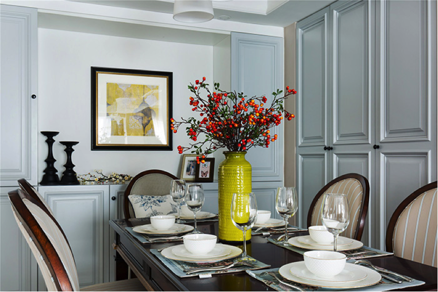 小小的餐桌精致典雅,非常节省空间。餐桌上的花给人添加了一些小资的生活情调。与客厅的花饰搭配,体现出美式风格的气息,餐桌上的高脚杯给人一种无限遐想的感觉。