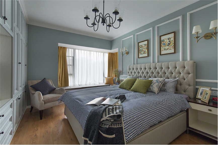 简约清新的美式卧室,彰显着大气温馨的感觉,主要以功能性和舒适为主,浅格子的床单,很冷静优雅的感觉。卧室背景墙的画与窗帘有个很好的呼应。这样平淡而且复杂的点缀给人一种放松的感觉。