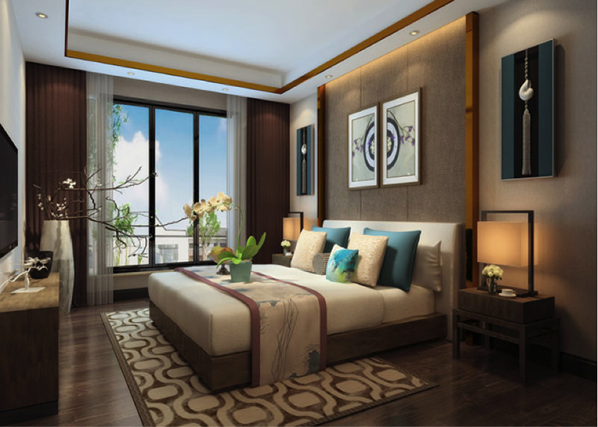 一个追求品质的人得要注重卧室的色调选择,卧室以原木色为主调,搭配少量白色,与卧室的大飘窗搭配起来。使整个空间看起来更加的明亮大方,丝薄的白色的窗帘会增加卧室的优雅感,床头两侧搭配了艺术感的台灯,白色的花瓶、不规则图形的地毯、墙上的对称画框体现出主人个性化的美感和品味。