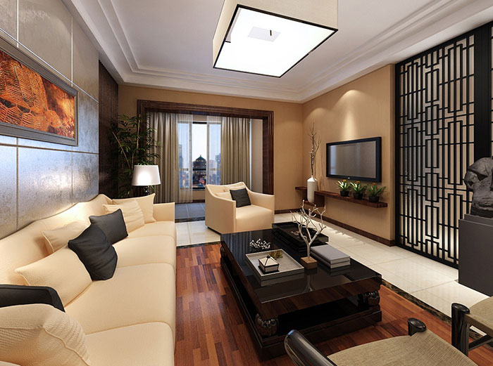 该案例是紫苹果别墅装修公司付老师做的新中式案例,整个空间兼具现代的时尚与中式的古典。客厅家具款式简单,但都兼具时尚与美观,慵懒造型的沙发摒弃传统的中式太师椅等木质家具,体现着新中式的舒适与实用。木质地板与大理石瓷砖的分布组合别有一番风情,色调温润典雅,同时飘窗的设计补充了室内的光线需求,整个客厅立体感、层次感十足。