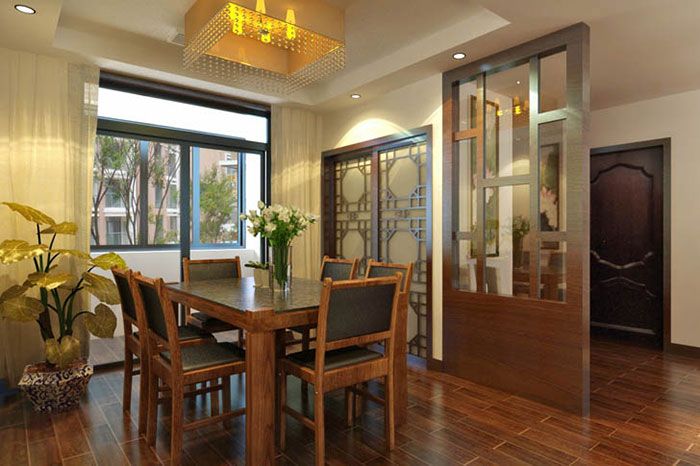 紫苹果别墅装修公司设计师刘老师在设计时考虑传统的中式实木椅,希望通过木质家具将东方的意向展示出来,同时给人木质家具天然的古色搭配鹅黄色的窗帘和黄叶绿植,新中式家居的亲切感与舒适感洋溢在餐厅的每一个角落。开放式的空间设计同时又强调了其空间的实用性和功能性,无处不体现着以人为本的设计理念。