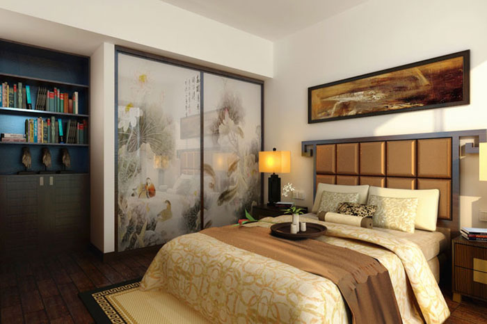 卧室空间的设计考虑到户型面积的因素,特意设计了一个传统中式靠墙的书柜,实用性俱佳,搭配床头的两盏暖黄色台灯,满足了主人夜晚喜欢躺床上夜读的喜好。中式的屏风式样的推拉门嵌以中式的花鸟画,中式元素与现代材质的巧妙兼柔,丝绸般顺滑的布艺床品的相互辉映,在这古风古韵中的景致中,散发出迷人的东方魅力,营造卧室独特的睡眠氛围,整个空间氛围更加融洽。