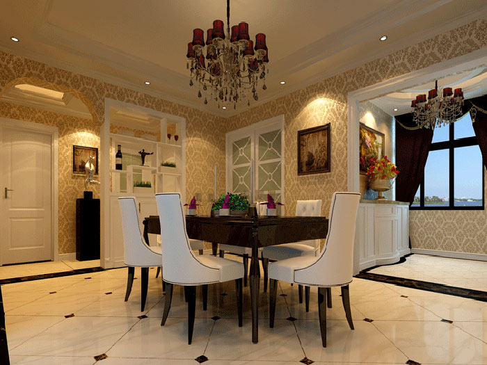为了方便生活的起居和更大化地利用空间,设计师跟业主商量之后对餐厅的设计采取的是开放式的布局设计,整个空间看起来更加开阔,增强了空间的通透感。在保证各个空间功能互不影响的情况下,客厅、餐厅、厨房一体的开放式设计让一家人的生活起居更加便利。整体统一的碎花壁纸,为整个空间注入了几分悠闲的田园风气息,这也是主人追求的悠闲舒适的生活,完美契合业主的需求。