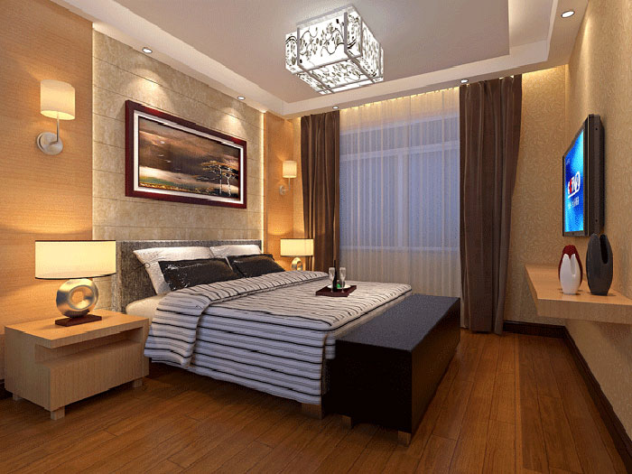 卧室的设计向来讲究温馨安静,任何风格的卧室更多的都是强调其功能性。忙碌了一天回到家中,卧室是人们摆脱一天的劳累与束缚的休息场所,设计师在设计时追求的是功能与形式的和谐统一。通过精致典雅的条纹床品,搭配原木材质的床头柜,床头的台灯和床头背景墙上的壁灯发出的暖黄色的灯光给舒适温馨的空间多了几分活泼的元素,精致典雅之中而不乏轻松浪漫的感觉。
