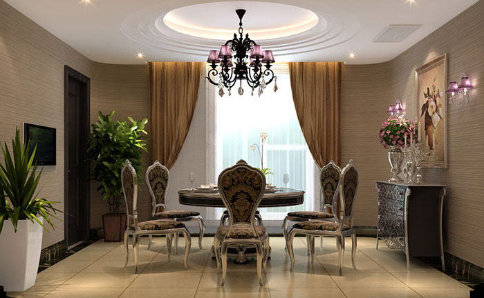 紫苹果别墅装修公司设计师谢老师在设计餐厅时结合散文的写作手法“形散神不散”的设计手法,用现代的手法和材质还原欧式的古典气质,圆形的层叠造型的灯池打造出古典的穹顶的效果。墙面以原木材质的壁纸装饰,与流苏造型的浅棕色窗帘搭配,温暖的阳光慵懒地射进室内,与暖黄色的地板烘托出居室的稳重与华贵。