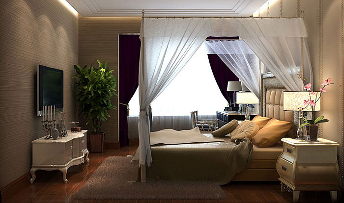 主卧在设计上,深色木质地板与原木色的壁纸搭配营造出现代欧式鲜有的古典与温馨。纯白色薄纱窗帘和酒红色的帷幔在色彩上融入了整个空间,既保证了卧室空间的私密性同时又保证了室内白天的光线,整体空间氛围和谐一致,各种装饰互相呼应,用多元化的设计体现出居住者对生活的需求个性化及文化品位。