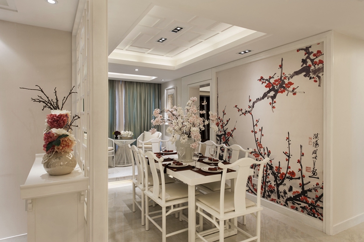 紫苹果别墅设计公司陆老师介绍虽然中国传统艺术里讲究留白,但是在家居设计中不适宜大面积的留白,否则会让人感觉稍显冷清,不太温馨。而红色是中国风里最常用到的颜色,它象征这热情,象征着温暖。就像是该餐厅的背景墙一样,整面墙的红梅图,很好地兼顾了这两点,让本来是纯色的白墙,瞬间就拥有了艺术感,简洁而又大气,清新而又优雅。