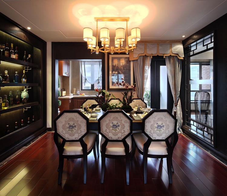 紫苹果别墅装修公司设计师陆老师根据业主的生活习惯在餐厅设计上为了方便一家人的生活起居,采用的是餐厅和厨房开放式的布局设计。藏酒柜的设计造型简单,不像传统的博古架那样呆板。虽然造型简单,但是收纳功能极强,满足了家居设计要求的实用性。民族文化符号的餐椅搭配精致的餐具和红酒,体现着中国传统文化的包容性。海纳百川,有容纳大。