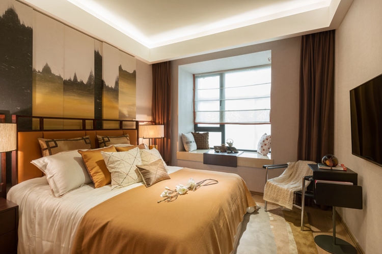卧室的设计温馨雅致,无论是暖黄色的床品和床头背景墙上金秋黄色调的刮花,整体的搭配体现了设计的包容性。简易的阳台设计成一个小茶台,主人可以在此尽情享受着午后惬意慵懒的阳光。虽然卧室空间面积不大,但是肌理感层次感极强,精致不失温和。