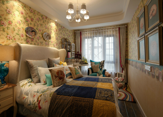 紫苹果别墅装饰公司设计师陆老师在对卧室空间设计时考虑到卧室户型不大所以在装饰品的选择上力图打造卧室的温馨感和舒适性。在中式风格之外混大了田园风格的设计元素,不同于田园风格大碎花壁纸的是该卧室的床头背景墙用的是小碎花壁纸,更显精致与优雅,结合其他优雅的民族风情的床品和装饰品,营造一种“丛林密语,鸟语花香”之感。