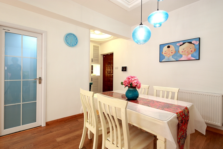紫苹果别墅设计公司曾老师在设计餐厅时依然沿袭田园风格,餐桌椅采用木质家具,但是用米白色的涂料加以装点,避免了原木色调的乏味,整个搭配高雅温馨,兼具时尚感。海蓝色的吊灯造型简单又不花哨,让你发现原来用餐也可以变得这么有情调。大面积的留白给人舒适感,置身于这样的环境中,可以让忙碌了一天的心慢慢的沉淀下来,让思绪放空,静享安逸。